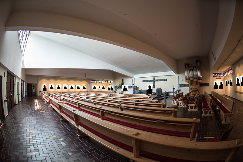 Zum 50jährigen Jubiläum der Pfarre St. Marien installiert die Fotogruppe übergroße Schwarz-weiß-Portraits im Kirchenraum.